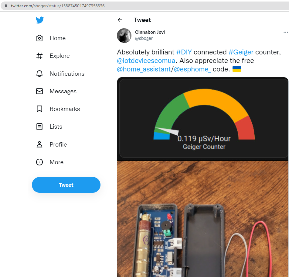 Absolutely brilliant #DIY connected #Geiger counter, @iotdevicescomua. Also appreciate the free @home_assistant/@esphome_ code. 🇺🇦 pic.twitter.com/QoblsKuclB